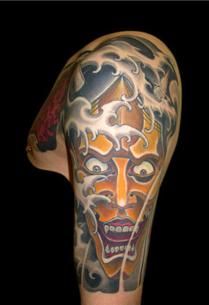 有朋友问,“般若”和“般若心经”有什么关系?其实,这里的“般若”和佛教的《般若心经》里的“般若”不是一个意思---佛教的“般若”是指佛的智慧,而这里是说一个女鬼的面部,表示的是“愤怒的相”,其实更主要的是要表示女性的“嫉妒”。如果你要是理解错了意思这次可要好好记住了啊,千万别在和你的纹身师沟通错,会错意,纹错了精神。